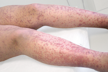 主要表现为紫红色瘀点或瘀斑,好发于四肢及臀部,尤其是双下肢伸侧和踝关节周围,呈对称性分布,可反复分批出现,颜色从紫红色到暗褐色不等。