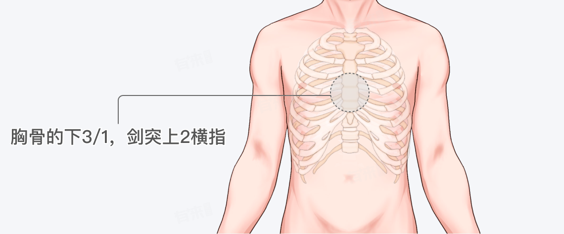 1、两乳头连线中点:这是比较直观且容易操作的定位方式,在大多数正常体型的成人中,找到两乳头连线的中点位置即可。