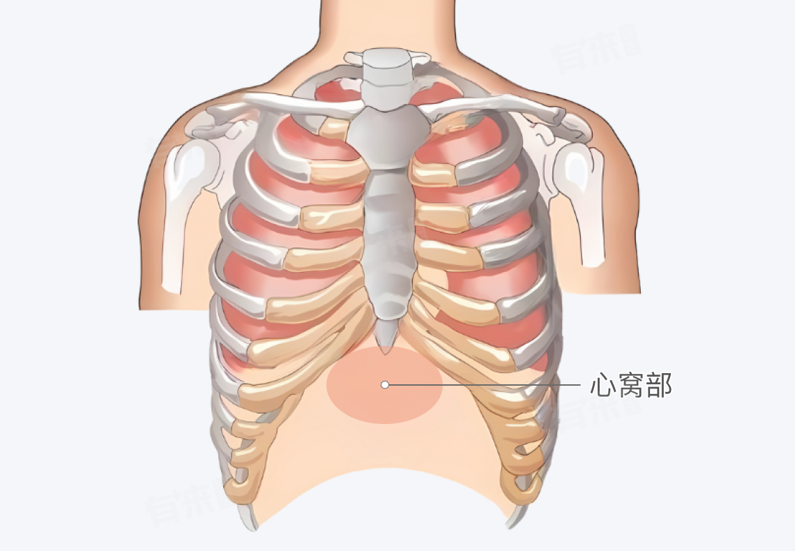 心窝部主要是指人体胸部中央、胸骨剑突(位于胸骨最下端的部分)下的凹陷区域。从体表来看,这个位置大致在两乳头连线的中点下方。这个区域在医学上也常被称为“胃脘部”,因为它的深部靠近胃的贲门和部分心脏组织。
