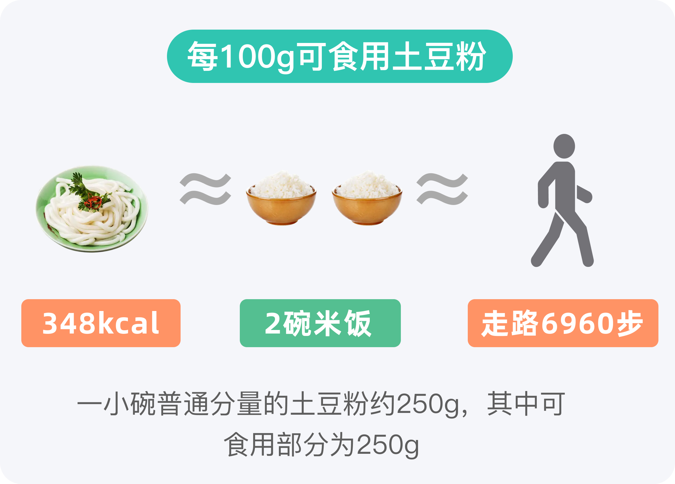 土豆粉的热量达到348kcal/100g,在营养学上属于高热量食物,一小碗普通分量的土豆粉约为250g,热量约为870kcal,大约相当于5碗米饭的热量,热量相当高,食用时要特别注意合理搭配与量的控制,避免对健康造成不良影响。