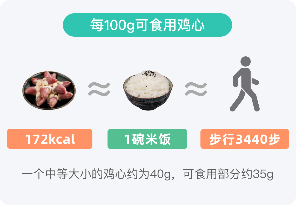 鸡心作为鸡的内脏之一,属于中等热量食物,每100g可食用鸡心的热量约为172kcal。鸡心的热量主要来源于脂肪和蛋白质,只有极少部分热量来源于碳水化合物。鸡心适宜消瘦人群食用,但肥胖、高胆固醇等人群应谨慎食用,正常成年人建议每天食用鸡心的量控制在50g。