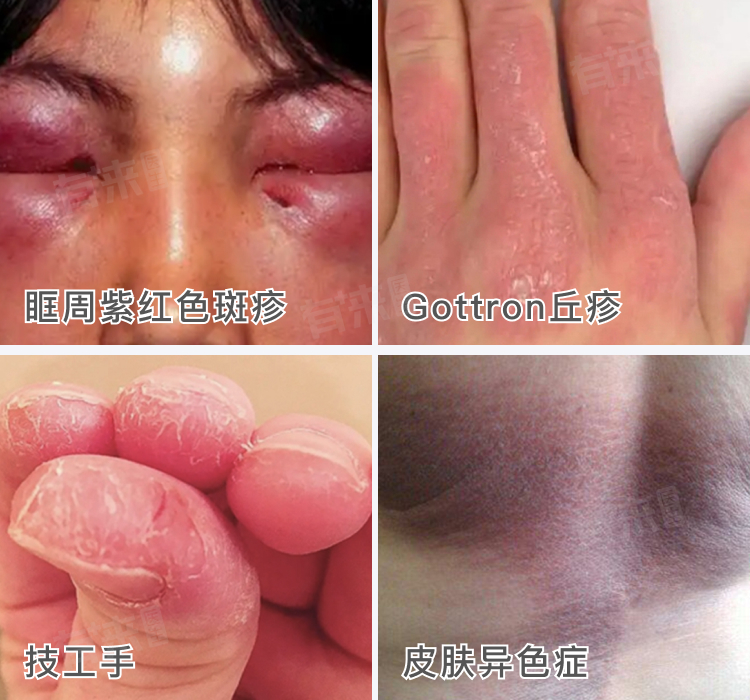 皮肌炎是一种主要累及皮肤和肌肉的自身免疫性疾病,症状包括眶周紫红色斑疹、Gottron丘疹、技工手、皮肤异色症及其他皮肤表现,以及肌肉无力、疼痛、压痛和萎缩等。