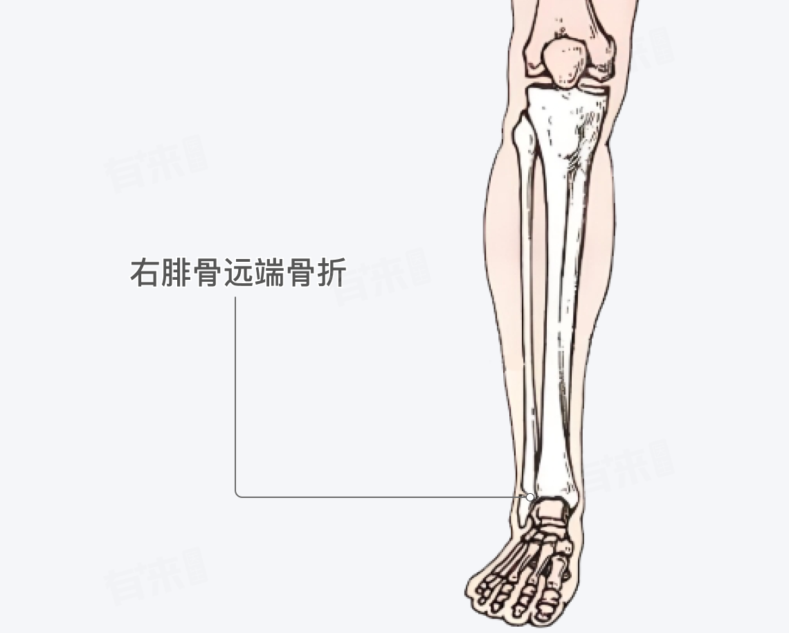 - 骨折原因:右腓骨远端骨折一般是由于直接暴力或间接暴力造成,如踝关节扭伤、跌落伤等。