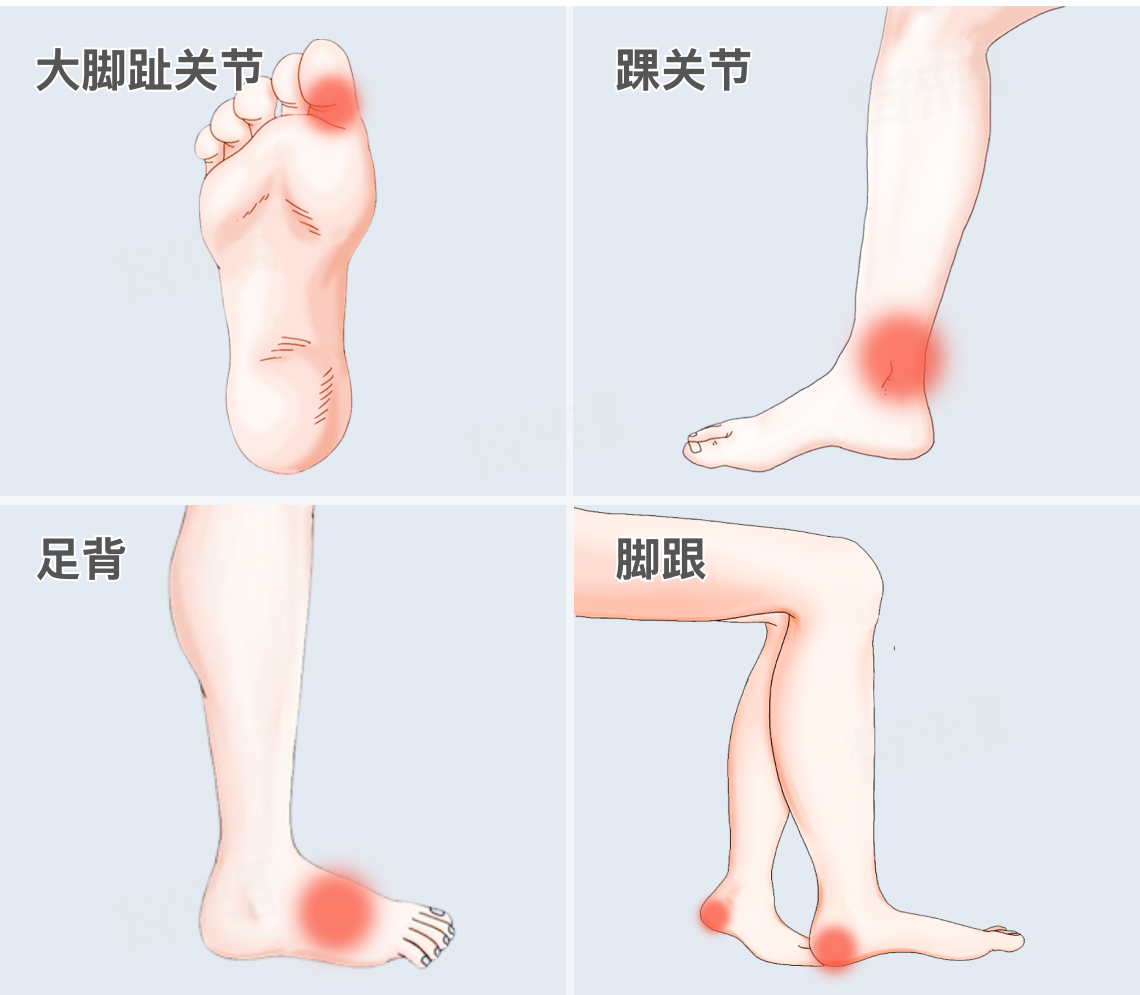 痛风引起的脚部疼痛通常发生在多个位置,但主要集中在关节和软组织,如大脚趾关节、足背、脚跟、踝关节,因此出现不适时需积极就医诊治,以明确诊断。