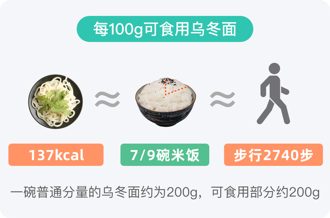 一袋不含调料的乌冬面重量约为200g,所含热量约为274kcal,大约相当于1.6碗米饭的热量。由于乌冬面含有较高的碳水化合物,需注意食用量,以防止热量摄入过多导致体重增加。在成人的一餐中,占比50%-60%。
