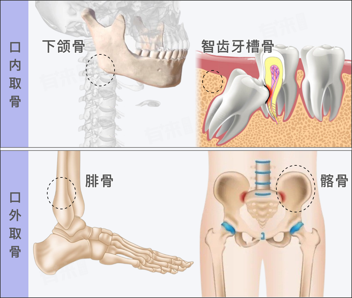 种植牙自体骨取骨可分为口内取骨和口外取骨,前者常取于下颌骨、智齿牙槽骨,后者常选择腓骨和髂骨部位,这些部位的选择主要基于骨质缺失的情况、手术便利性以及患者的整体健康状况。