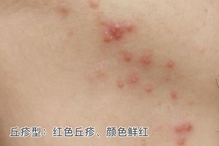 1、丘疹型毛囊炎:表现为毛囊口出现针尖至绿豆大小的红色丘疹,丘疹通常孤立存在,质地较硬,顶端可有轻微的脓疱形成,颜色鲜红,边界相对清晰,周围皮肤可有轻度的红晕。