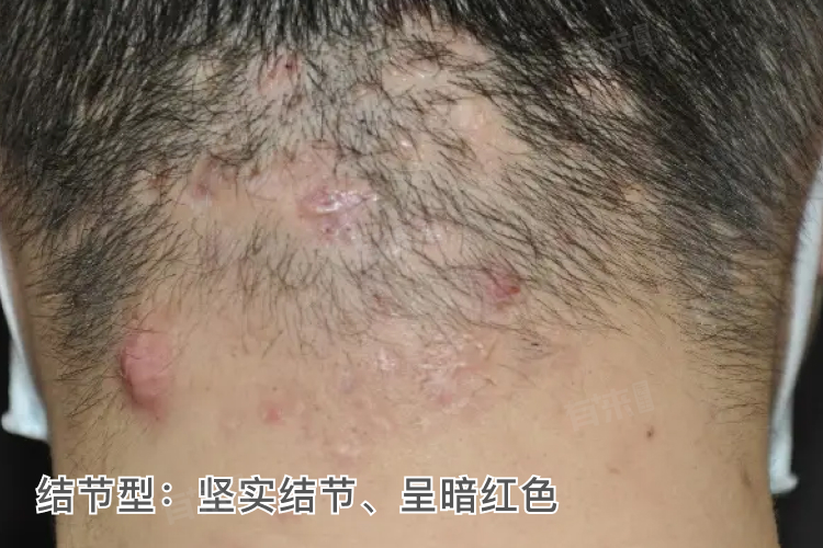3、结节型毛囊炎:结节型毛囊炎的表现为毛囊周围形成坚实的结节,大小不一,一般比丘疹和脓疱更大,直径可达数厘米,结节颜色多为暗红色或紫红色,质地较硬,触之有疼痛感,常见于背部、肩部等部位。