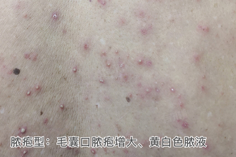 2、脓疱型毛囊炎:外观上可见毛囊口处的脓疱明显增大,脓疱内充满黄色或白色的脓液,脓疱壁较薄,容易破裂,破裂后会流出脓液,随后形成结痂,脓疱周围的皮肤红肿较为明显,炎症范围相对扩大,好发于面部、颈部、臀部等部位。