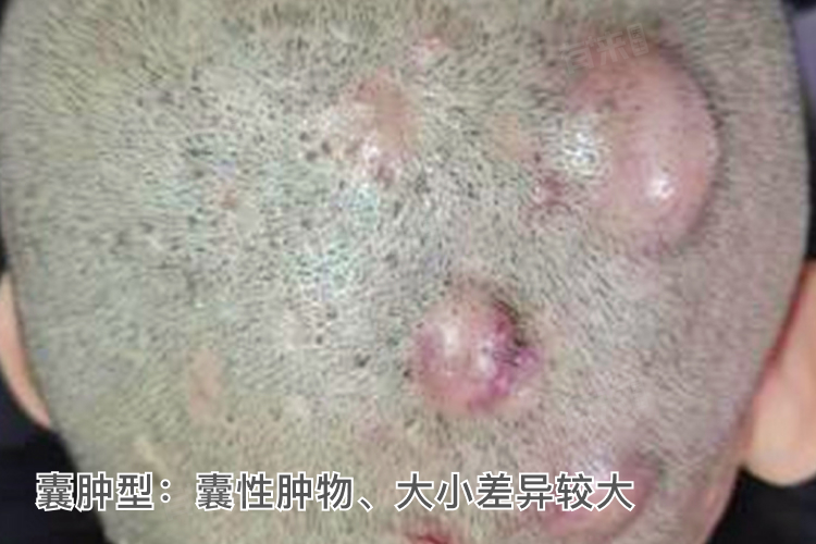 4、囊肿型毛囊炎:囊肿型毛囊炎外观上呈现为囊性肿物,大小差异较大,可从黄豆大小到鸡蛋大小不等,囊肿表面皮肤光滑,有弹性,颜色与周围皮肤相近或稍红,囊肿内含有大量的脓液、皮脂和角质物等,挤压时可有波动感,好发于头皮、面部、颈部等皮脂腺丰富的部位。