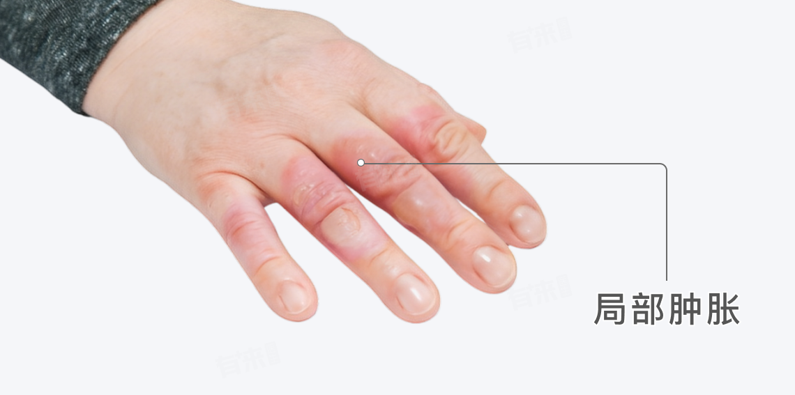 肿胀可能会迅速出现,并在接下来的几个小时内逐渐加重。肿胀的手指头可能看起来比平时更粗,甚至呈现出纺锤形。