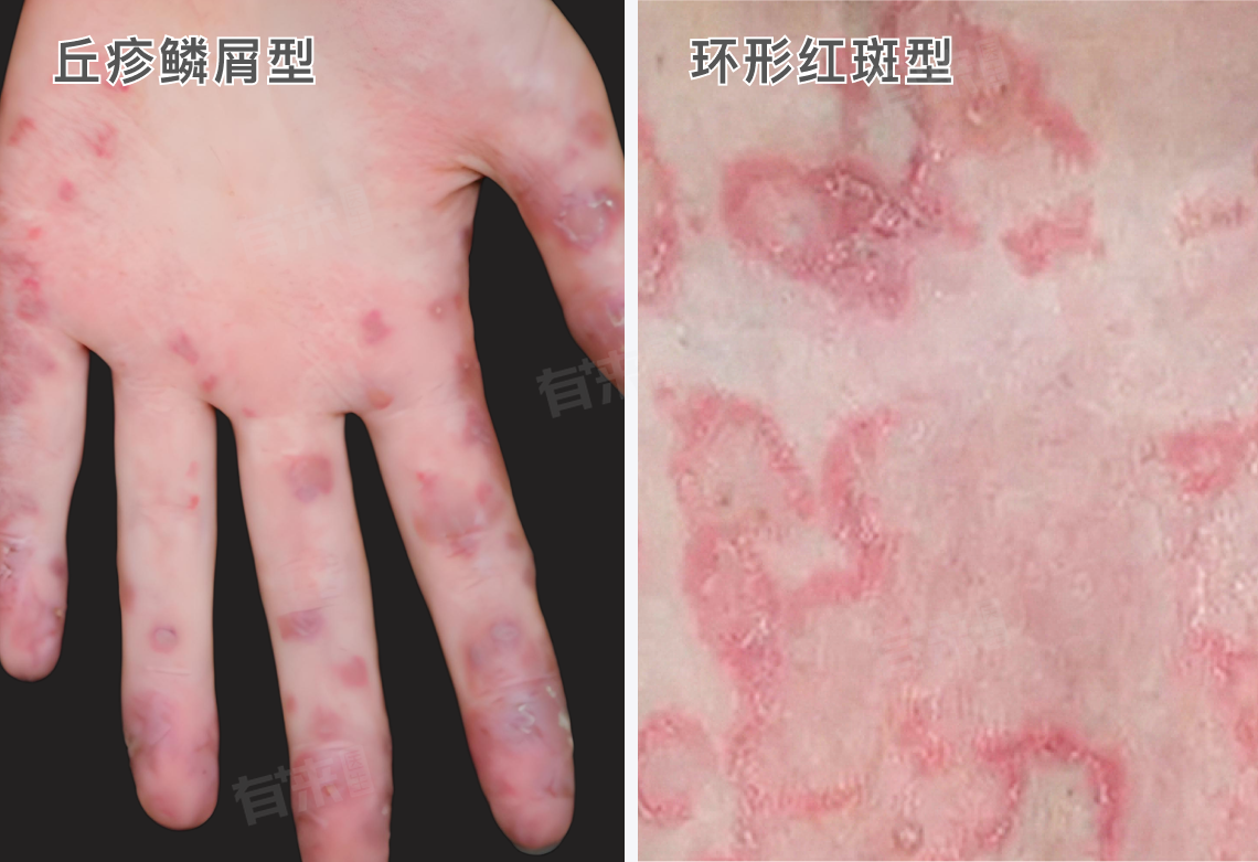 - 分布位置:丘疹鳞屑型可分布于躯干、上肢、颈部等部位;环形红斑型主要分布在躯干、四肢的外侧,通常不累及面部。