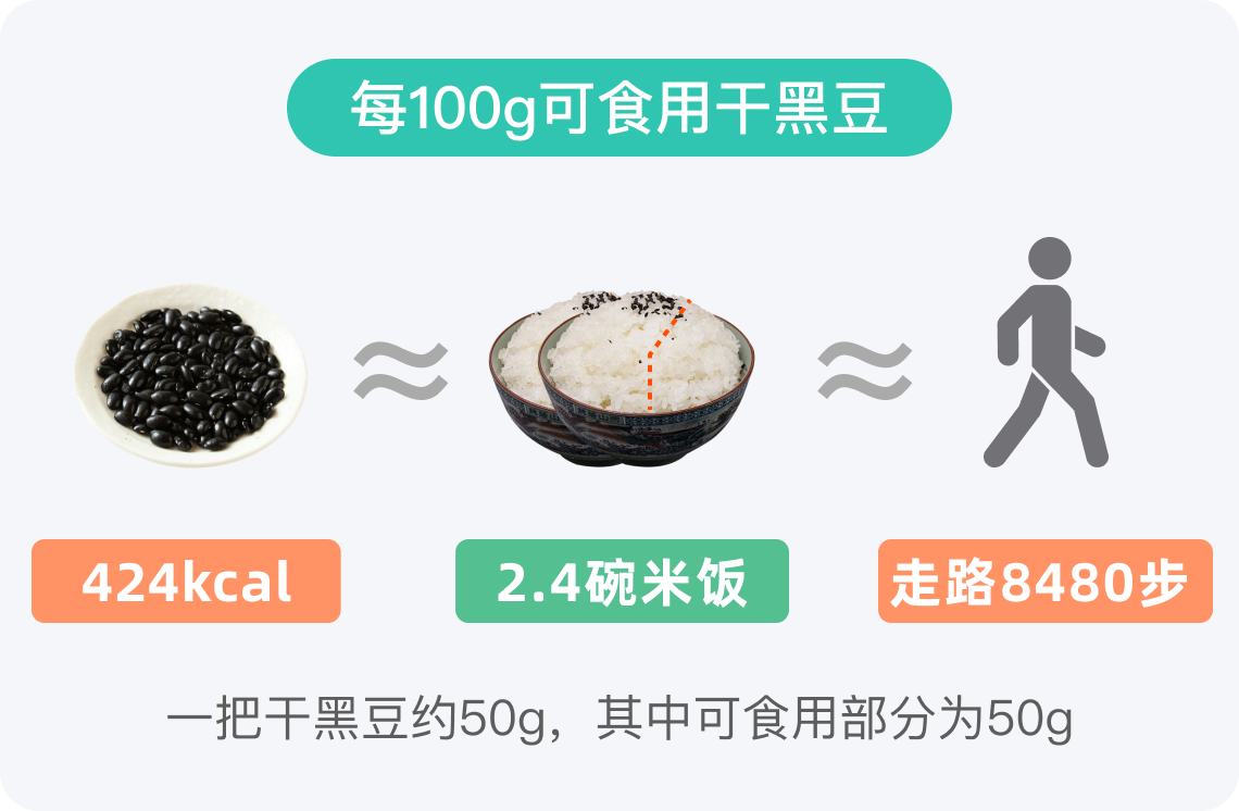 在营养学上,每100g食物热量低于100kcal的为低热量食物,100-200kcal为中等热量食物,高于200kcal为高热量食物,因此干黑豆属于高热量食物。一把干黑豆约50g,热量为212kcal,相当于1.2碗米饭的热量。对于部分成年人一餐500-800kcal的热量需求而言,干黑豆所占比例较高,但由于其营养丰富,适量食用是有益的。