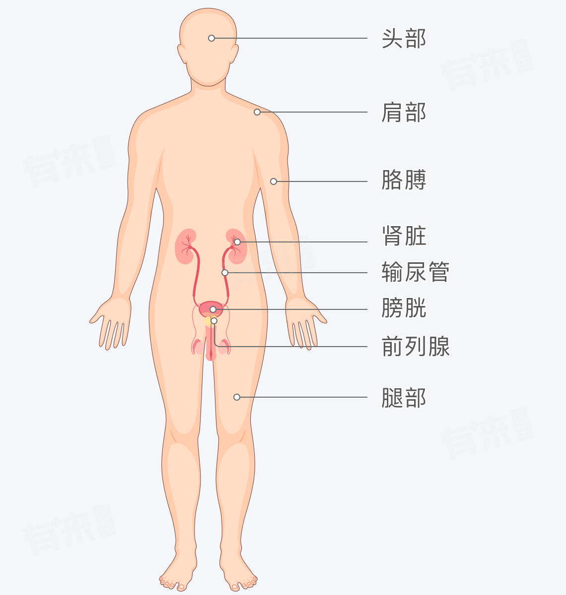 4、前列腺:前列腺是男性特有的器官,位于膀胱下方,包围着尿道,当前列腺受到细菌感染或无菌性炎症时,会引起疼痛和不适,这种疼痛可能位于下腹部、会阴部或腰部,并可能伴有排尿异常、性功能障碍等症状。