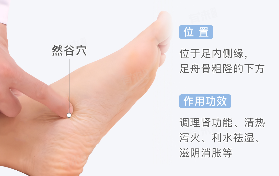 然谷穴是足少阴肾经的常用腧穴之一,位于足内侧缘,足舟骨粗隆的下方。具有调理肾功能、清热泻火、利水祛湿、滋阴消胀、舒筋活络、消炎止痛、改善不适的作用功效。