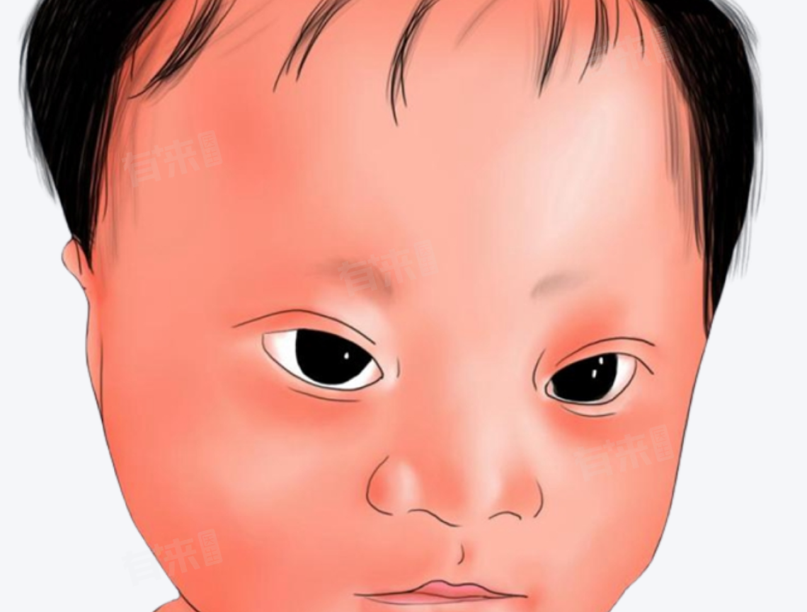 21-三体综合征的患儿从出生时就具有明显的特殊面容,具体表现为塌鼻梁、鼻梁低平、面部扁平;耳朵小且耳位低;眼裂小、眼距宽、双眼外眦上斜,可能有内眦赘皮,眼睛常眯成小缝或呈呆滞状。