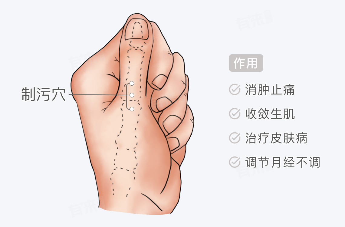 制污为董氏奇穴,在大指背第1节中央线上,具有消肿止痛、收敛生肌等作用,可采取点按法、艾灸法等对制污穴进行刺激,操作时应由专业中医师进行,以确保安全性。