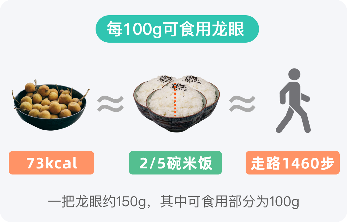 龙眼属于低热量食物,一颗龙眼重量通常为15g左右,一把龙眼大概150g,可食用部分大约为100g,其热量为72kcal左右,对于部分成年人,一餐热量需求约500-800kcal,一把龙眼热量在一餐中所占比例相对较低,占比14%-22%。