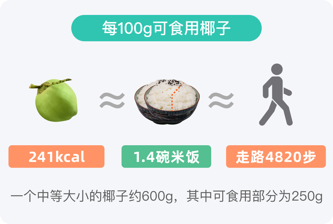 根据营养学标准,通常将每100g热量超过200kcal的食物称之为高热量食物,所以热量为241kcal/100g的椰子属于是高热量食物。一个中等大小的椰子约600g,其中可食用部分约250g,食用后产生的热量为603kcal,相当于3.5碗米饭的热量。