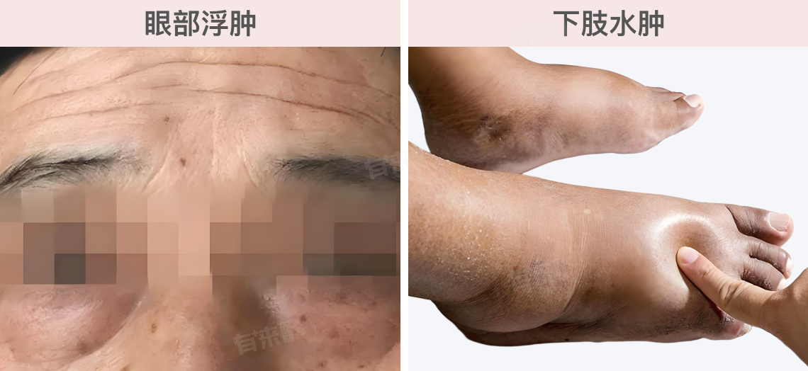 由于肾小球滤过膜通透性增高导致血浆白蛋白降低,造成血液胶体渗透压下降,水分会从血管内渗出至组织间隙而引起水肿。水肿通常首先出现在眼睑、面部等位置,随着病情进展可扩展到下肢、腹部等部位。