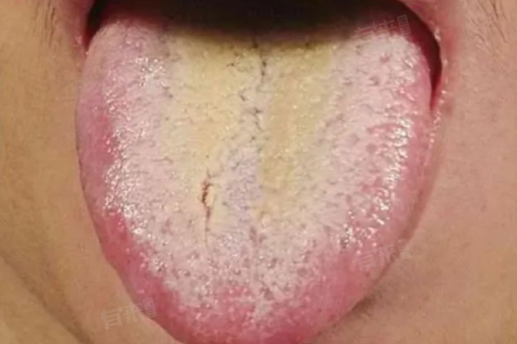 舌苔呈现黄色,质地较腻,可能伴有湿润感,覆盖在舌面上,有时伴有口臭、口苦等症状,提示体内湿热内蕴。