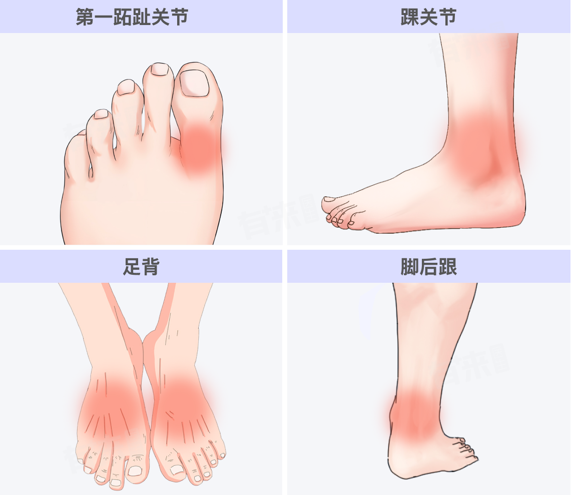 - 部位描述:踝关节是连接小腿和足部的关节,痛风疼痛主要出现在踝关节周围,包括内外踝及关节前方、后方等部位。