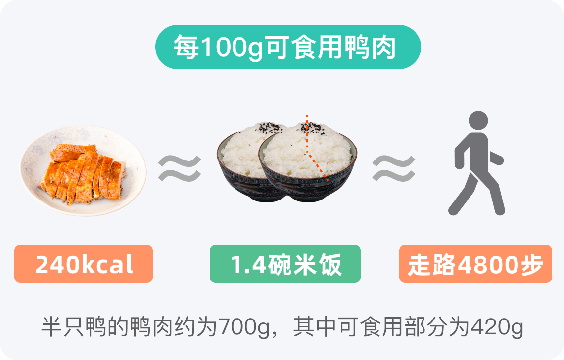 鸭肉热量水平较高,半只鸭的鸭肉可达700g,可食用部分约为420g,可食用部分热量约为1008kcal,相当于5.8碗150g的米饭热量。而成年人一般一餐热量需求为500-800kcal,半只鸭可食用部分的热量在一餐中所占比例非常高,需要严格控制摄入量,建议根据自身情况合理搭配其他食物,并适当运动,以维持健康的饮食平衡。
