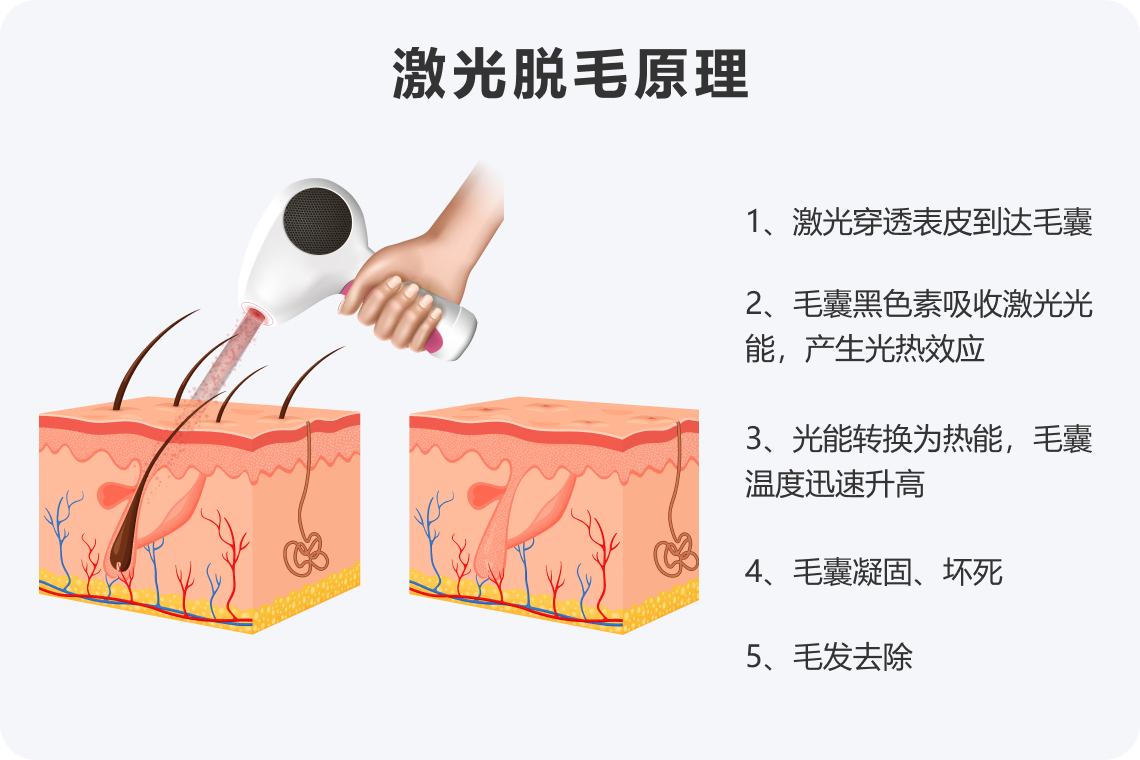 激光脱毛是利用选择性光热动力学,使激光穿透皮肤表层到达毛囊,光能转化为热能破坏毛囊组织,从而使毛发失去再生能力的脱毛方法,一般需要每隔1-3个月做一次,具体时间因人而异。因为毛发的生长周期包括生长期、退行期和休止期,需要等待新的毛发长出后,再进行下一次治疗。