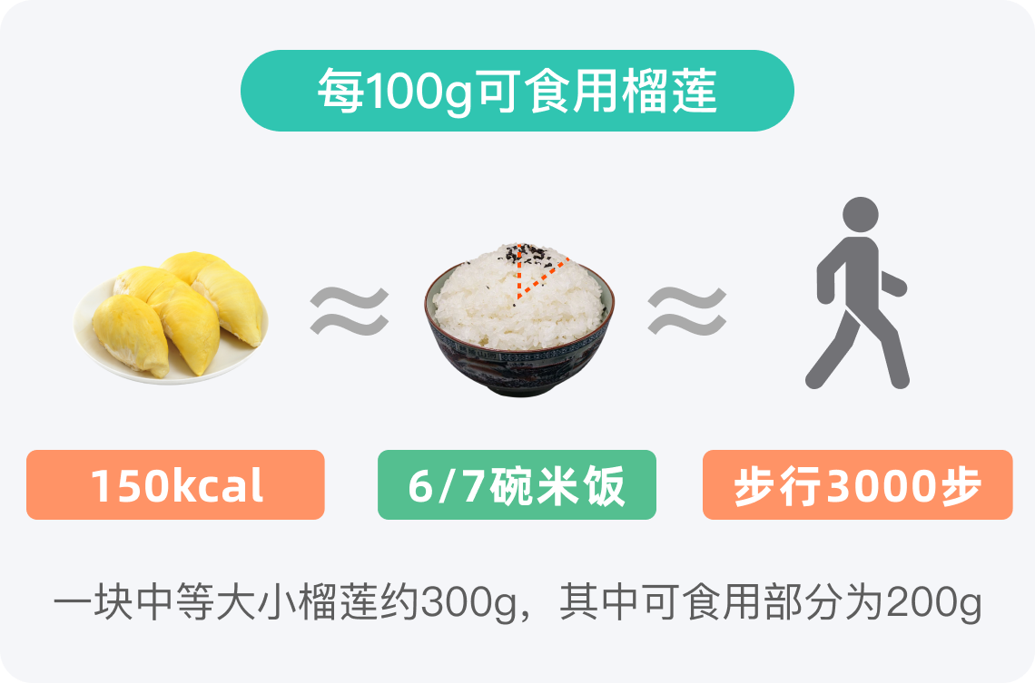 榴莲的热量中等,每100g可食用榴莲热量为150kcal,相当于6/7碗米饭。榴莲的热量来源于高糖成分、脂肪和蛋白质,适宜大多数人群食用,一般健康成年人每次食用100-150g榴莲为宜。