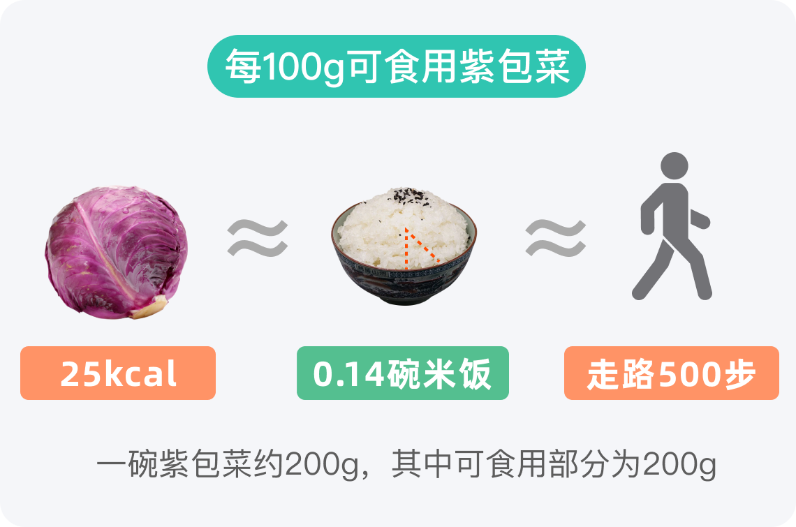 一碗紫包菜大概200g,食用后所产生的热量为50kcal,约等于0.3碗米饭的热量,对于减肥人士而言,是一种非常理想的减肥食物。