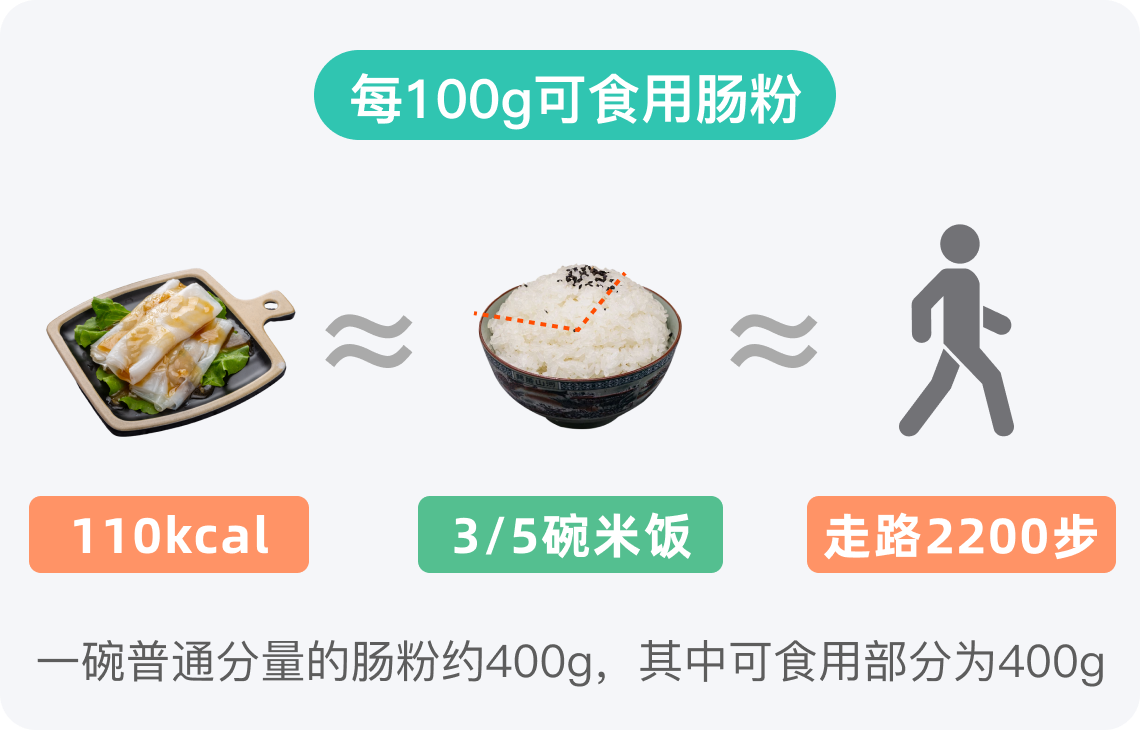 肠粉属于中低热量食物,一碗普通分量的肠粉约为400g,其热量约为440kcal,大约相当于2.5碗米饭的热量。对于部分成年人,一餐热量需求约为500-800kcal,可见一碗肠粉的热量在一餐中所占比例可能较高,占比55%-88%,所以食用时要特别注意。