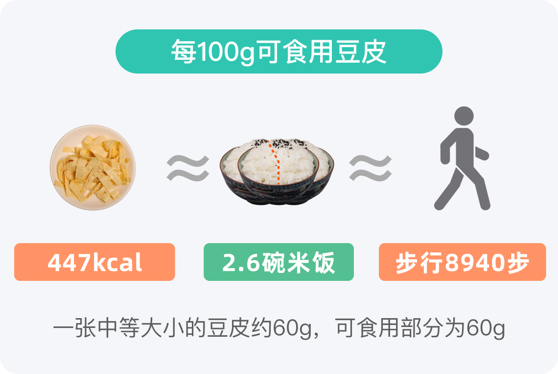 每100g豆皮热量约447kcal,一张中等大小的豆皮可食用部分约60g,热量为268kcal,约相当于1.5碗米饭。在成人一餐中,如果总热量摄入按600-800kcal计算,一张中等大小豆皮的热量占比约为1/3-1/2。