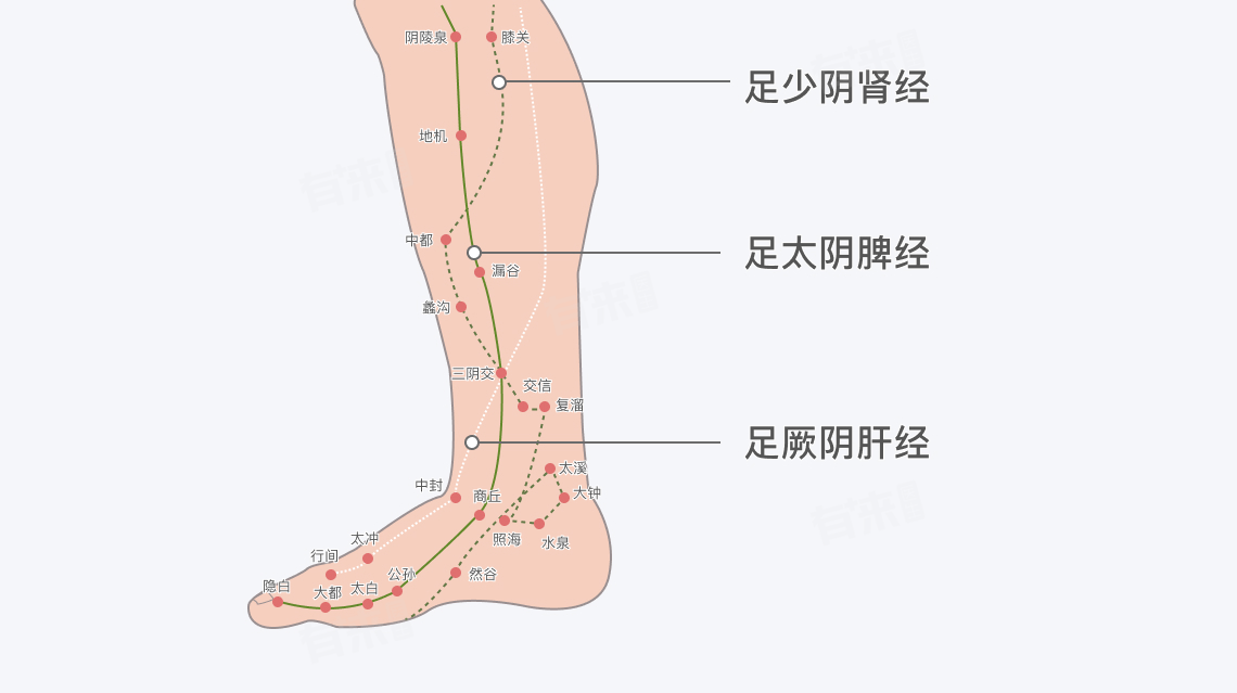 1、足太阴脾经:起于足大趾内侧端隐白穴,沿着足内侧赤白肉际,上行经过内踝前缘,沿小腿内侧正中线上行。在脚部,其主要循行于足大趾内侧、足底内侧以及内踝前方区域。