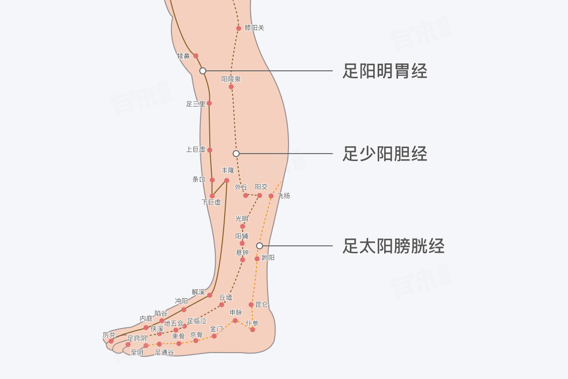 1、足阳明胃经:起于鼻翼旁迎香穴,下行入上齿中,还出挟口环唇,沿下颌角上行耳前,沿发际,到额颅。其经别从足背分出,进入腹腔,与胃相连。在脚部,主要循行于足背外侧及第二、三趾间。