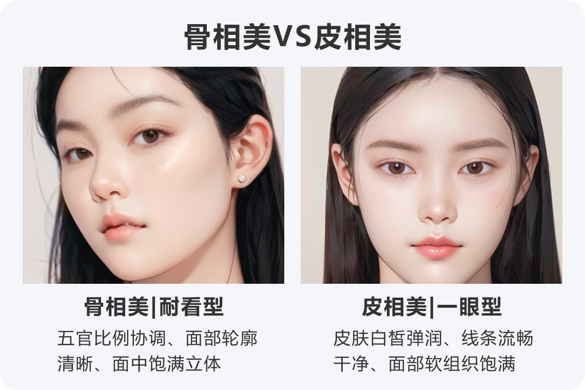 皮相美和骨相美是两种不同的美感,皮相美注重皮肤的细腻度和五官的精致程度,给人直观浅显的美感,但惊艳感可能随时间减弱,且抗衰老性较差。骨相美则注重面部骨骼的立体感和轮廓感,呈现出深邃持久的美感,耐看性强,且能经受住岁月的考验。此外,皮相美更适合淡妆或裸妆,而骨相美则具有很强的可塑性,能驾驭不同妆容风格。