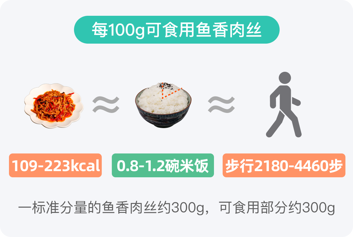 一标准分量的鱼香肉丝约300g,可食用部分约300g,几乎为全部食材,无需去除任何部分。根据热量换算,这份鱼香肉丝的热量大约在327-669kcal,相当于2.4-3.5碗中等大小的米饭,每碗米饭约150g。因此,在享受鱼香肉丝的美味时,我们也需要注意控制食用量,避免热量摄入过多。
