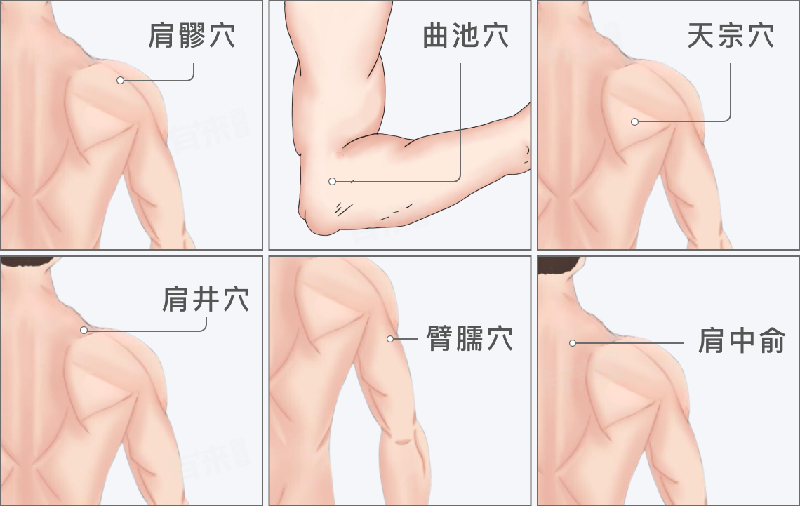位于屈肘成直角时,肘横纹桡侧端与肱骨外上踝连线中点。艾灸曲池穴也可以改善肩膀疼痛。