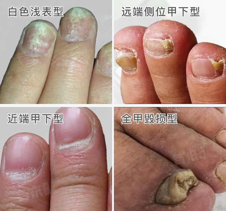 灰指甲主要表现为指甲(趾甲)出现斑点、变色、浑浊、增厚等,常见四种类型,即白色浅表型、远端侧位甲下型、近端甲下型、全甲毁损型。