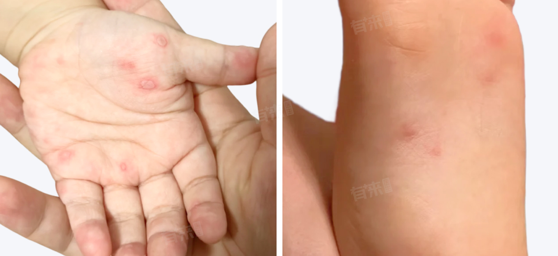 手足部的皮疹数量从几个到几十个不等,有时皮疹还可出现在臀部、膝盖、肘部等部位,呈离心性分布。这些皮疹一般不会瘙痒,但在疱疹破溃后可能会出现局部感染等情况。