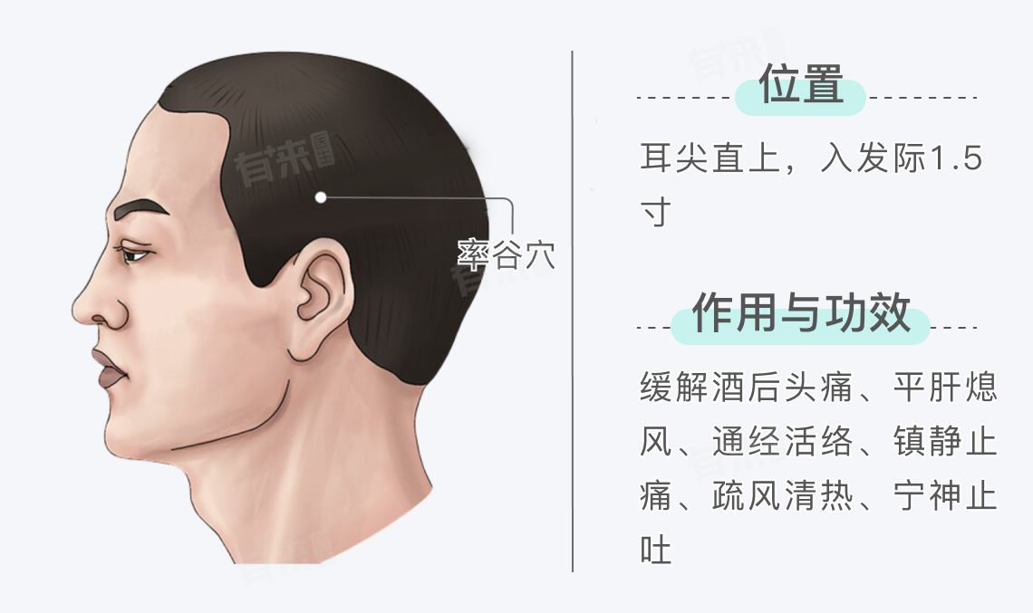 - 缓解酒后头痛:率谷穴还是足少阳胆经与膀胱经的交会处,对于饮酒过量后的头痛和不适感有缓解作用,通过按摩率谷穴,能够帮助身体更快地代谢酒精,减轻肝脏负担,缓解酒后头痛。