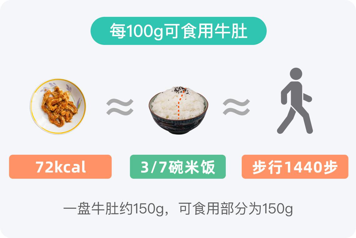 每100g牛肚的热量为72kcal,一盘牛肚可食用部分大约150g,热量约为108kcal。将108kcal转换成具体的米饭量,相当于3/5碗白米饭。在成年人的一餐中,这一热量约占总热量需求的5%-10%,具体比例取决于个人的基础代谢率和日常活动强度。
