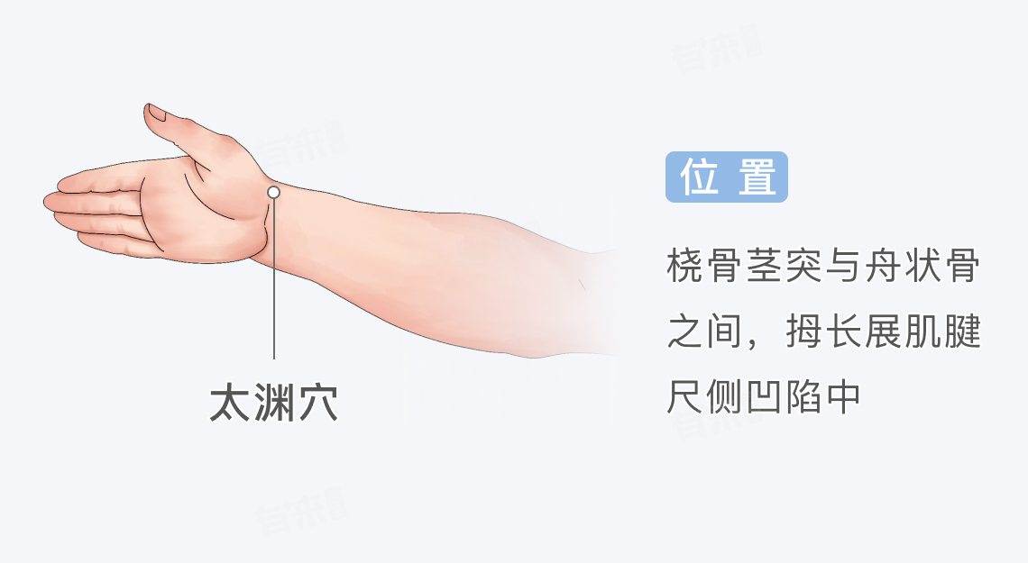 太渊穴位于桡骨茎突与舟状骨之间,拇长展肌腱尺侧凹陷中。