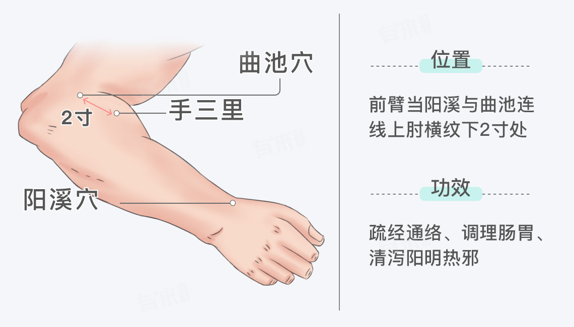 3、清泻阳明热邪:阳明经易受热邪侵袭,当阳明经热盛时,常出现发热、口渴、牙痛、咽喉肿痛等症状,手三里穴具有清泻阳明热邪的功效,通过针刺、艾灸或按摩等刺激方法,可使阳明经热邪得以疏散,减轻发热、牙痛等热证表现,对实热证有较好的清热泻火作用。