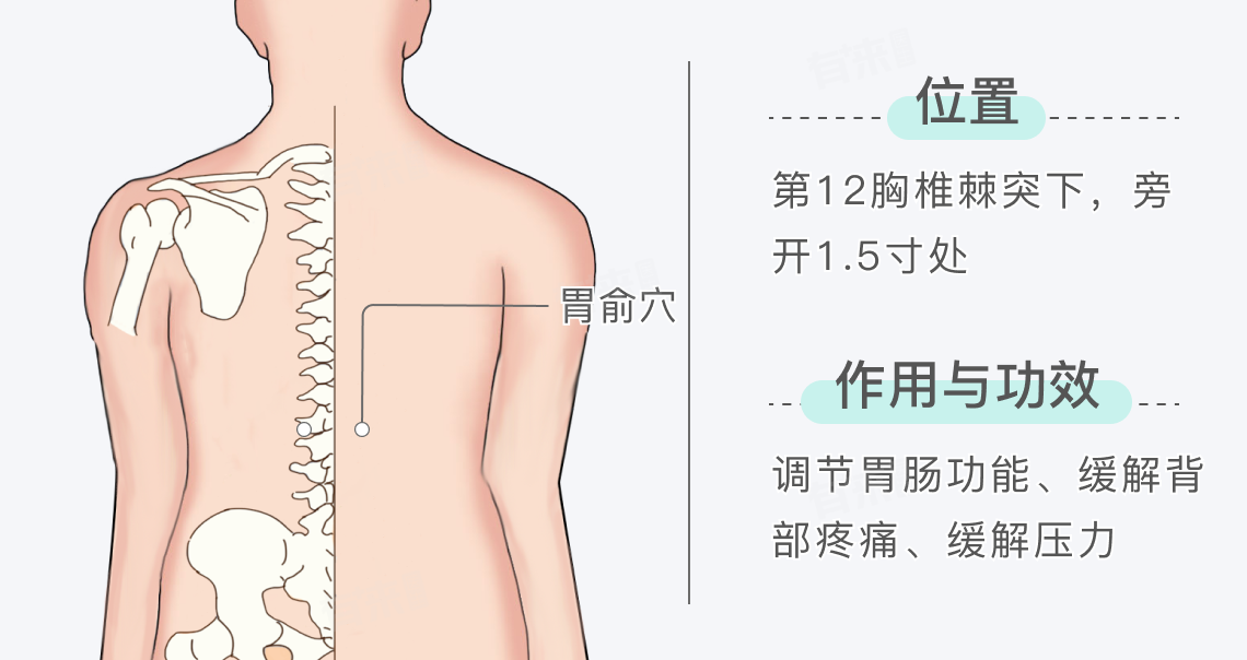 胃俞穴是足太阳膀胱经上的重要穴位,位于背部,在第12胸椎棘突下旁开1.5寸处,在此穴位进行按摩、艾灸、拔罐等中医操作,可起到调节胃肠功能、缓解背部疼痛等作用。