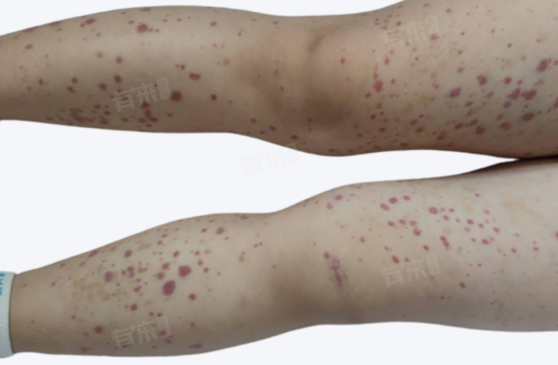 2、皮损特点:典型的皮疹为紫红色出血点,大小不一,刚开始时,可能是散在分布,主要出现在四肢及臀部,尤其是双下肢伸侧。随着病情发展,可以逐渐融合成片,形成瘀斑,颜色也会从紫红色变为暗紫色。