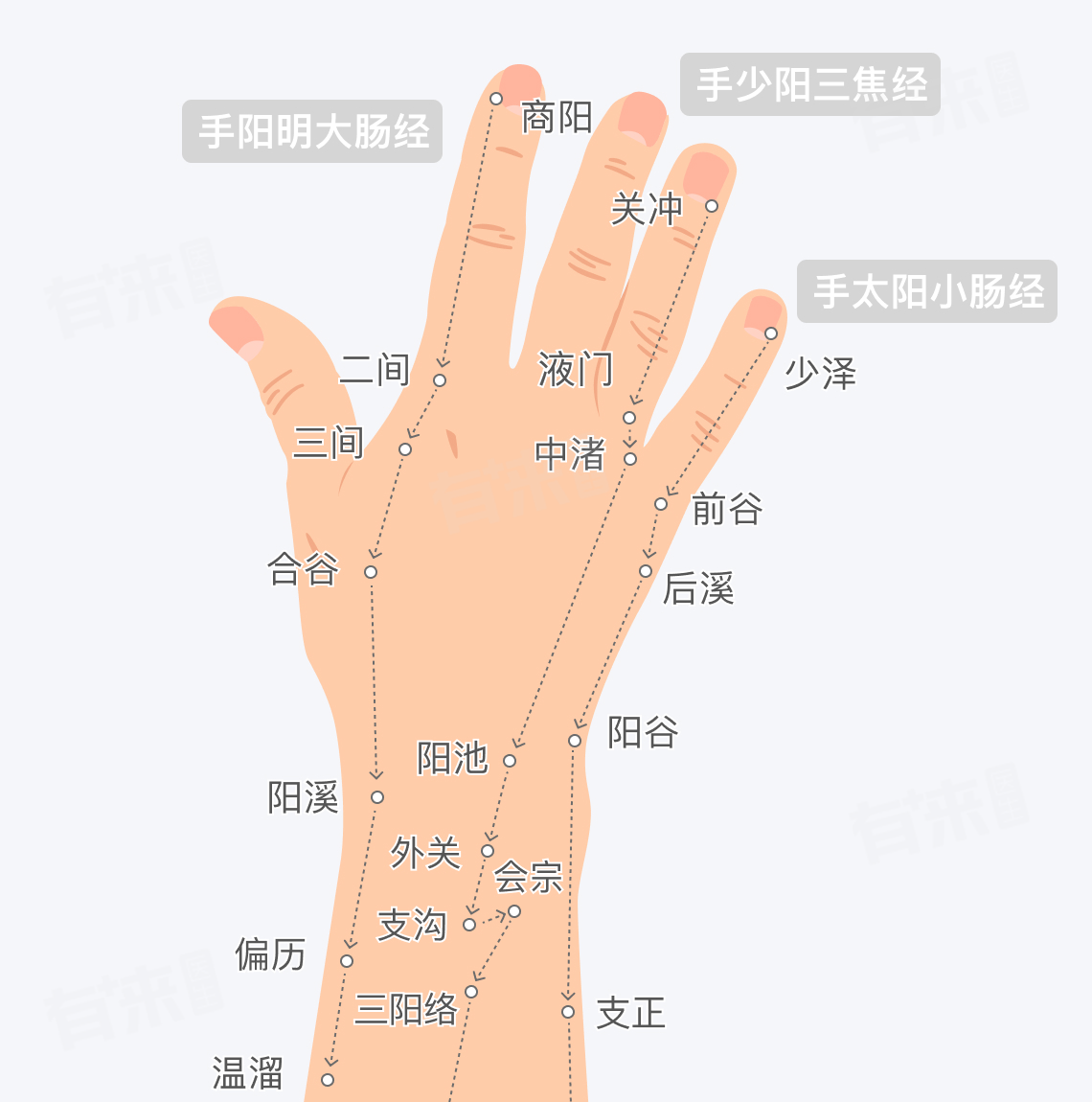 - 位置:起于无名指指端尺侧的关冲穴,沿手臂外侧中部上行绕至肩后,后止于眉梢凹陷处的丝竹空穴。