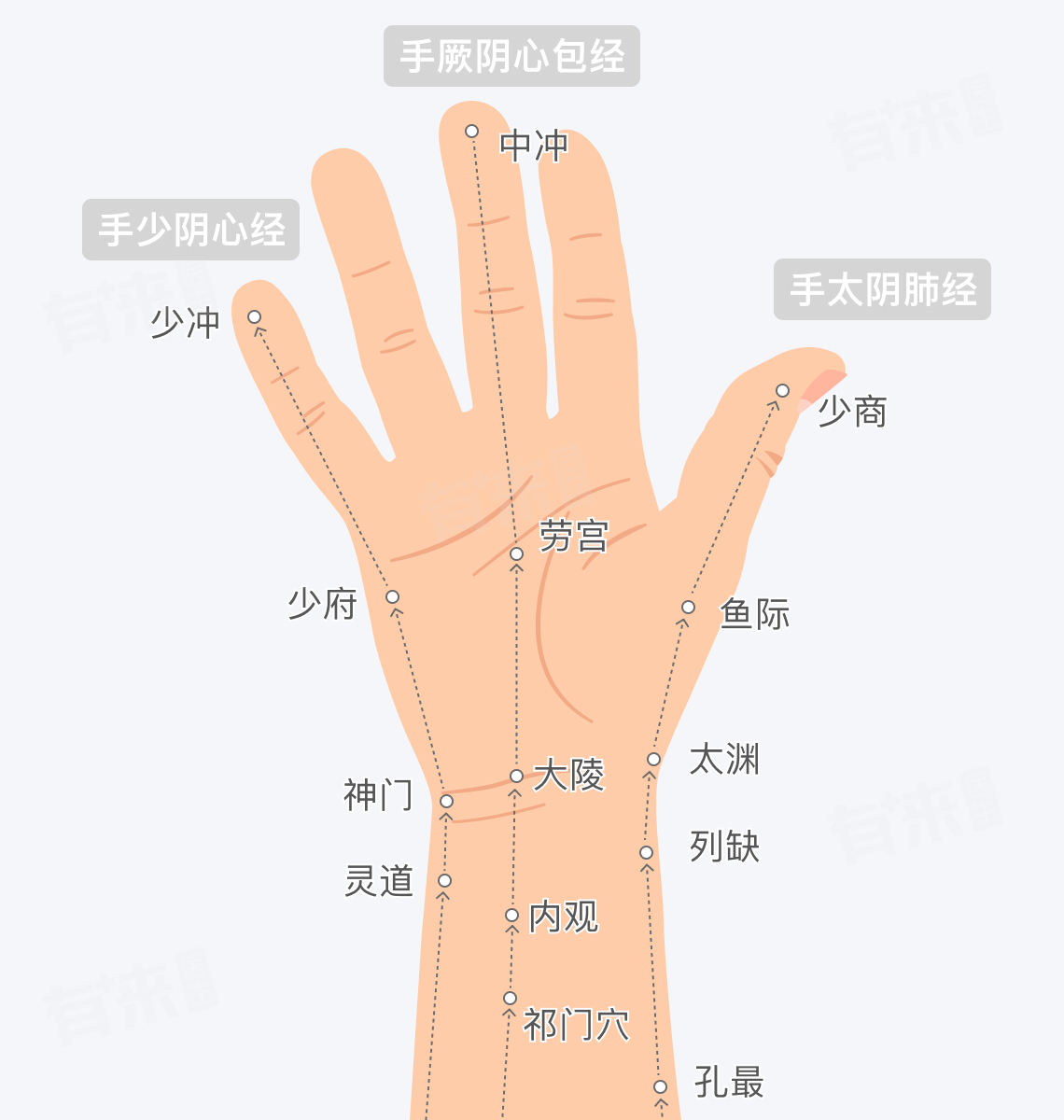 - 作用:主要负责心包的气血运行,可用于治疗心病、胸闷、胸痛等。