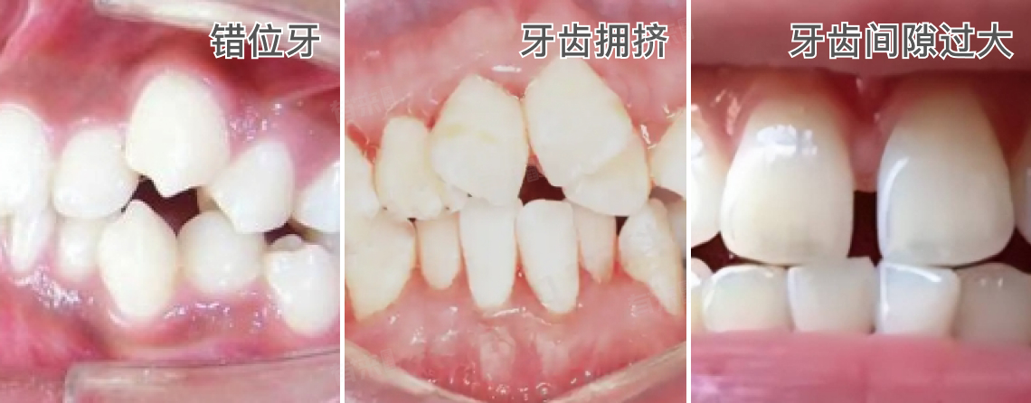 - 示例:错位牙(牙齿不在其应有的位置,可能向前、向后或向侧面倾斜)、牙齿拥挤(牙齿排列过于紧密,导致牙齿重叠或错位)、牙齿间隙过大(牙齿之间的空隙过大)。