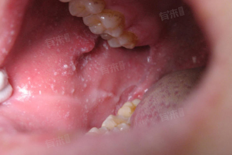 - 口腔麻疹黏膜斑:在发热2-3天后,可在宝宝口腔两侧颊黏膜近臼齿处看到白色小点,周围有红晕。