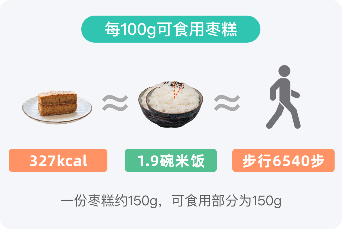 每100g枣糕的热量约为327kcal,而一份枣糕(可食用部分约150g)的热量为491kcal,相当于2.8碗米饭的热量。在成年人的一餐中,这份枣糕的热量占比可能达到70-90%,具体比例取决于个人的日常饮食习惯和总能量需求。